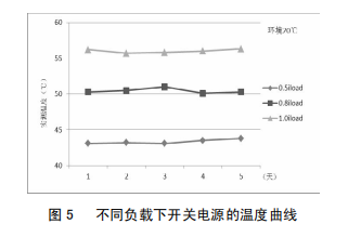 改進(jìn)后,為驗(yàn)證改進(jìn)效果,對(duì)開(kāi)關(guān)電源分別在0.5倍、0.8倍及1.0倍負(fù)載下進(jìn)行了為期5天的帶負(fù)荷試驗(yàn),圖5為不同負(fù)載下開(kāi)關(guān)電源的溫度曲線,由圖5可知,隨著負(fù)荷的增大,開(kāi)關(guān)電源問(wèn)題總體呈上升趨勢(shì);負(fù)載不變的情況下,同一溫度曲線基本保持平滑;開(kāi)關(guān)電源在額定負(fù)載下運(yùn)行,最高溫度不超過(guò)57℃,未達(dá)報(bào)警值,開(kāi)關(guān)電源可靠性得到顯著提高。