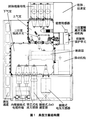 (1)高壓主電路的氣體絕緣技術和插接技術:對主電路電場進行了優化,以低壓力SF6氣體作絕緣介質;開發了內錐、外錐插接式電纜終端頭,插接式固體絕緣母線,選用硅橡膠絕緣的十字聯接套,端頭T形聯接套,插接式電壓互感器和避雷器。