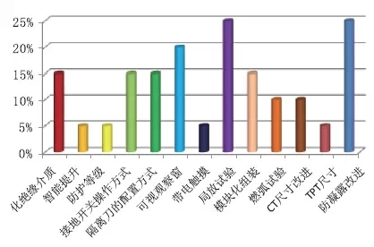 經(jīng)過調(diào)研被參與者心中新產(chǎn)品哪些部分應當進行優(yōu)化,認為應優(yōu)化絕緣介質(zhì)部分的占比15%,智能行進部分的占比5%,防護等級部分的占比5%,接地開關操作辦法的占比15%,阻隔刀的配置辦法的占比15%;可視觀察窗的占比20%,帶電觸摸的占比5%,局放試驗的占比25%,模塊化組裝的占比15%,燃弧試驗的占比10%,CT標準改善的占比10%;TPT標準的占比5%,防凝露改善的占比25%。如圖15所示。