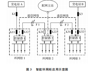 的區(qū)段,兩邊都能或者都不能檢測到故障信號的區(qū)段則不是故障線路,所以可快速容易的將故障點定位在K12和K21之間。開關K12會跳閘,開關K21保持分閘狀態(tài)并閉鎖,將故障區(qū)段切除。配網主站接收到隔離成功信息,通過調度自動化系統(tǒng)將開關K11合閘,恢復非故障區(qū)域供電。同理,當在F2處發(fā)生故障時,集中式智能控制器將采集到的故障信號傳輸到配網主站,配網主站對故障信號進行分析和邏輯判斷。通過故障點處在兩邊感受到信號不通的區(qū)段的判據,將故障定位在K22和K31之間。開關K3會跳開然后自動重合,開關K31、K22跳開后不再閉合,將故障區(qū)段切除。配網主站接收到隔離成功信息,通過調度自動化系統(tǒng)將開關K21合閘,恢復非故障區(qū)域供電。在整個過程中,從發(fā)現故障到故障隔離最后將非故障區(qū)域恢復供電所需要的時間非常的少,能夠最大限度的提高供電的可靠性,這是采用智能環(huán)網柜的優(yōu)越性所在